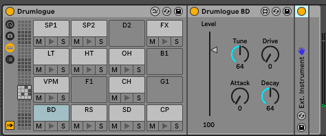 Furthermore, each pad has an external instrument device to route midi to the Drumlogue per pad and optionally, to bring the audio into the drum racks mixer and into live.